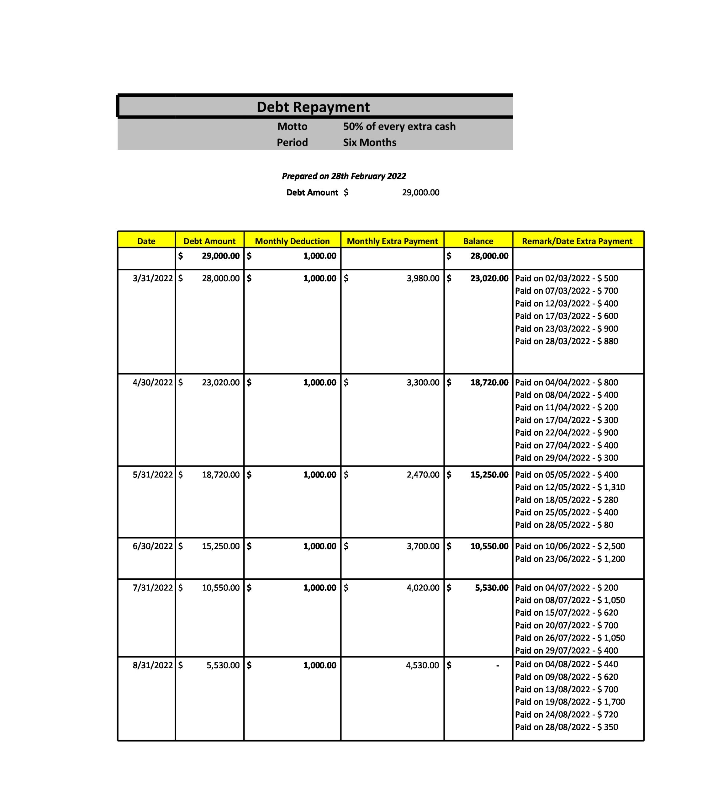 Making the spreadsheet was the first thing I did. It indicated the total amount of the debt I owed; I planned to make extra payments each month, and the regular monthly payments are also noted on the sheet. In the remark area, I listed the dates I made the additional monthly instalments.